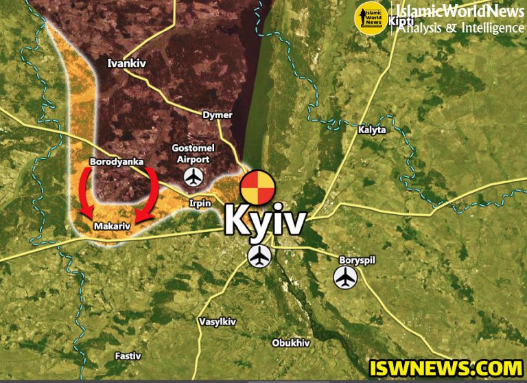 28 lutego siły rosyjskie przekroczyły Borodiankę i dotarły do Makarowa. Celem działań na tej osi jest odcięcie trasy Żytomierz-Kijów. Ogólnie rzecz biorąc, na mapie terenu nie zaszły istotne zmiany, a między siłami na zachodniej i północno-zachodniej osi Kijowa nadal trwają sporadyczne starcia.