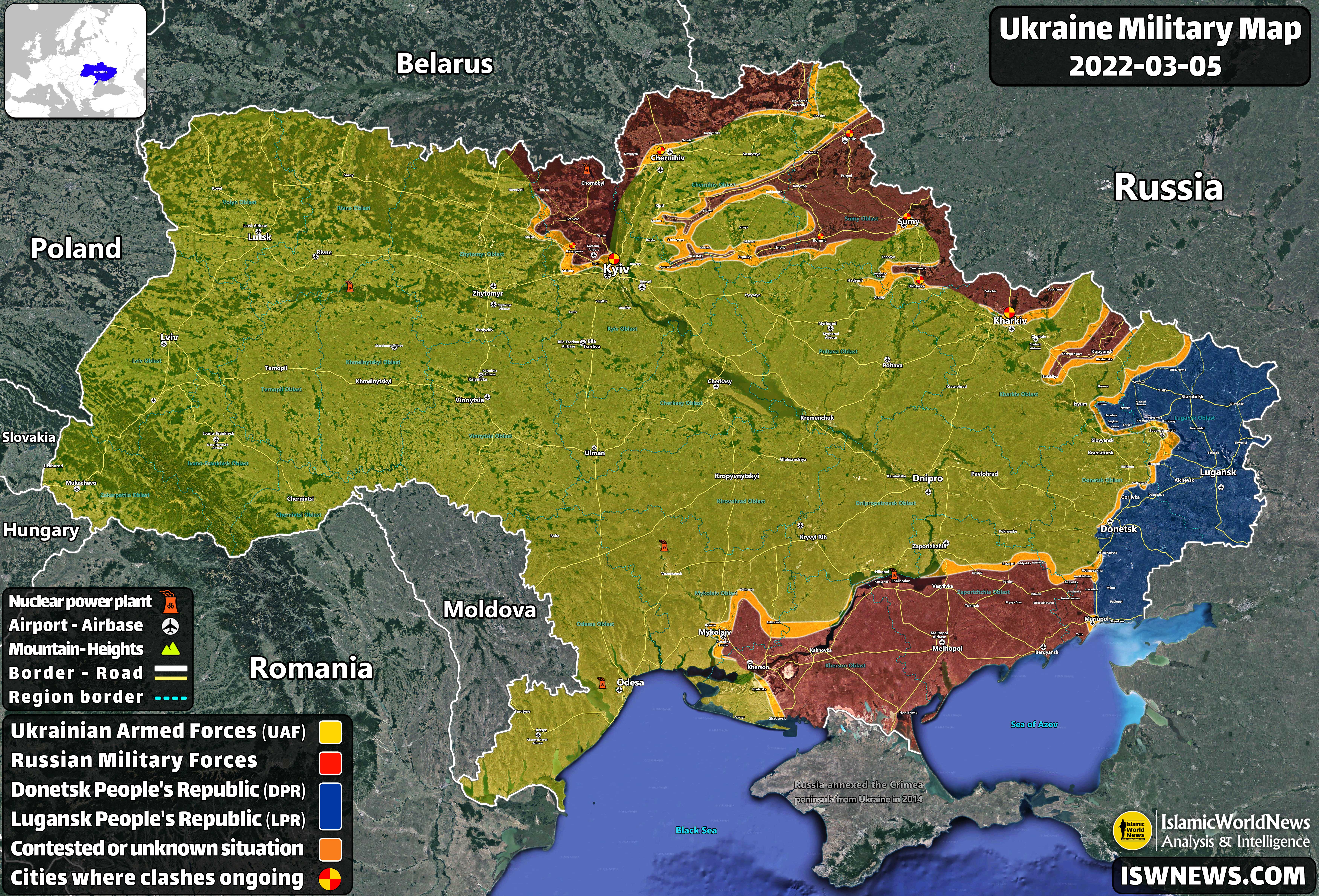 Poniżej publikuję przetłumaczony na język polski raport Islamic World News z podsumowaniem działań wojennych na Ukrainie z dnia 05.03.2022 – czyli dziesiątego dnia działań zbrojnych. Raport zawiera tym razem dużo więcej map, wykonanych w dość wysokiej rozdzielczości. Animacja powyżej przedstawia linię frontu w dniach 27.02.2022-05.03.2022. Postępy wojsk rosyjskich są jak poprzednio znacząco wolniejsze niż w pierwszych dniach operacji. Niemniej należy pamiętać, że nabytki terenowe są powiększane mimo zaangażowania znaczącej części wojsk rosyjskich w zabezpieczenie szlaków komunikacyjnych i oczyszczenie kontrolowanych obszarów z resztek formacji ukraińskich i przygotowań do kolejnej dużej ofensywy. Raport jest całkowicie bezstronny, co czyni niniejsze opracowanie unikatowym w ogarniętych wojną informacyjną mediach (polskich w szczególności …). Jako uzupełnienie do poniższego raportu polecam również nateriał wideo (z polskimi napisami opracowanymi przeze mnie) ze strony southfront.org, który omawia główne zdarzenia z poprzedniego dnia, 04.03.2022. Także ten materiał, mimo że opracowany przez aktywistów rosyjskich, jest relatywnie bezstronny (szczególnie w porównaniu ze „standardami” mediów III RP …). Zapraszam do lektury.