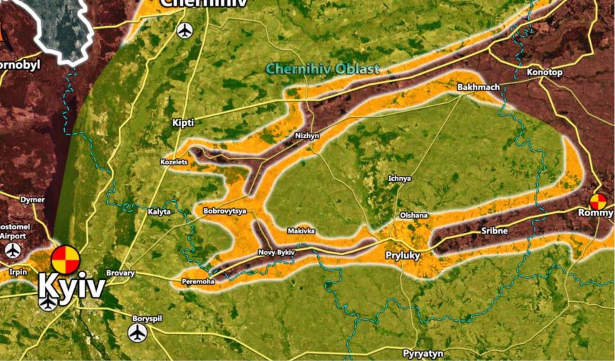 W ostatnich dniach odnotowano obecność sił rosyjskich w rejonach Kozielec, Bobrowicy, Peremoha. Sytuacja w obwodzie czernihowskim jest dość niejasna, ale śledząc ruchy rosyjskich wojsk można ogólnie ocenić sytuację.