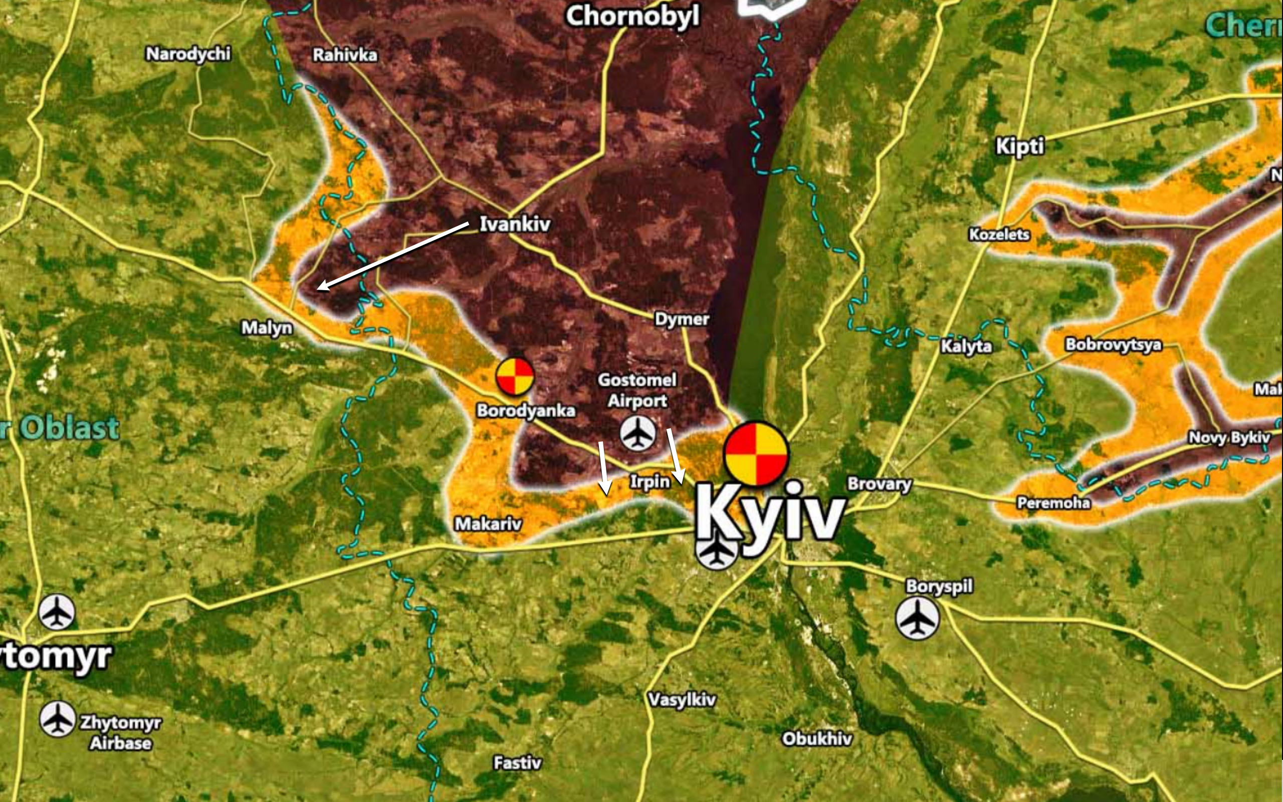 W okolicach Kijowa siły rosyjskie ponownie wkroczyły do miejscowości Irpin w zachodniej części Kijowa. Ponadto, według informacji podawanych przez ukraińskie źródła wojskowe, siły rosyjskie stacjonują w trzech punktach w okolicach miasta Małyń.