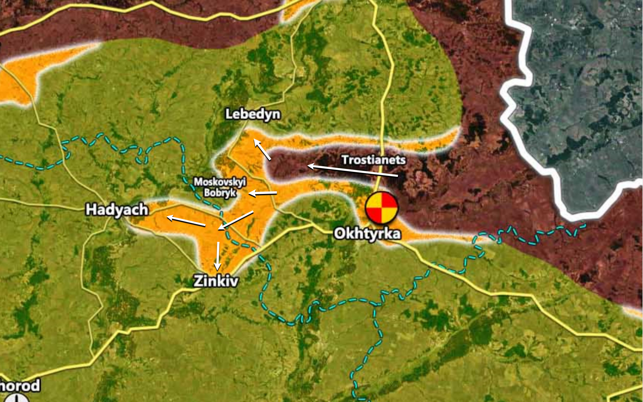 W obwodzie sumskim, w południowej części Sum, miasto Trostaniec znalazło się pod kontrolą wojsk rosyjskich. Siły rosyjskie posunęły się daleko na zachód. Pojawiły się doniesienia o tym, że wojskom rosyjskim nie udało się zdobyć Lebiedyna i Moskowskiego Bobryska; odnotowano jednak obecność sił rosyjskich na osi Hadyach i Zinkiw. Dwa dni temu siły ukraińskie pojmały kilku rosyjskich żołnierzy w rejonie Hadyach. Wskazuje to na obecność sił Rosji w tych rejonach.
