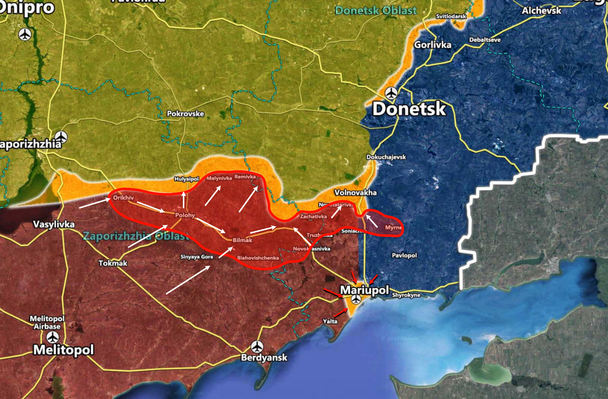 W ciągu ostatnich dwóch dni w obwodach zaporoskim i donieckim duże obszary na wschód od Zaporoża i na południe od Doniecka znalazły się pod kontrolą sił Rosji i DRL. Dzięki tym postępom droga Zaporoże-Mariupol została całkowicie odcięta. Ponadto, po wygaśnięciu zawieszenia broni, które miało na celu ewakuację ludności cywilnej z Wołnowachy i Mariupola, wznowiono działania zbrojne, a upadek Wołnowachy i Mariupola w najbliższych dniach jest nieunikniony.