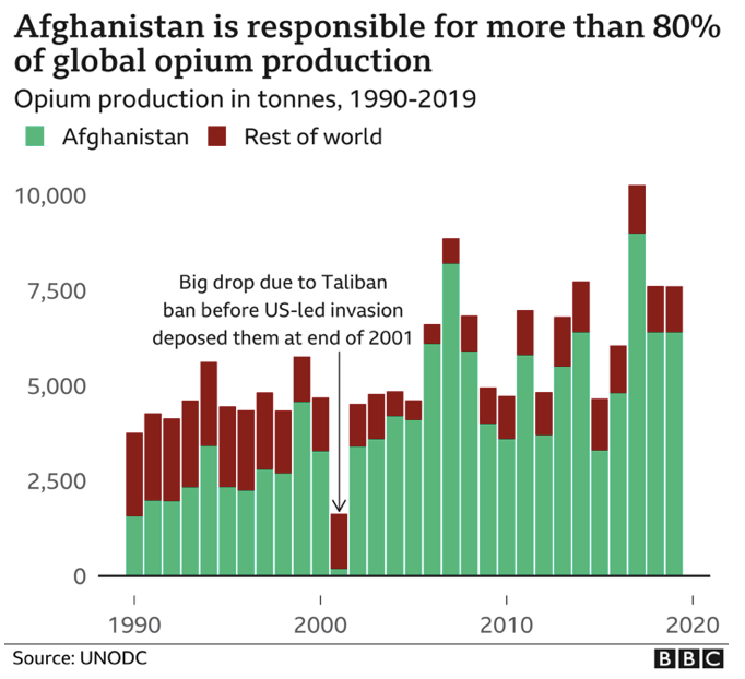 Zostało to potwierdzone w raporcie ONZ z maja 2001 roku, w którym „zaobserwowano niemal całkowity sukces w zakresie eliminowania upraw maku na obszarach kontrolowanych przez talibów”. Jednak natychmiast po inwazji USA i przejęciu kraju przez Stany Zjednoczone produkcja maku została wznowiona na olbrzymią skalę na przestrzeni kolejnych 20 lat. W rzeczywistości powierzchnia upraw maku do produkcji opium wzrosła z 163 tys. hektarów w 2019 r. do 224 tys. hektarów w 2020 r., co stanowi wzrost o 37% (Światowid: i teraz staje się oczywiste, skąd wzięła się klęska głodu w Afganistanie w roku 2021 … po prostu zabrakło ziemi uprawnej pod produkcję żywności …). Na przestrzeni lat Afganistan był odpowiedzialny za ponad 80% światowej produkcji opium, co ilustruje poniższy diagram ONZ: