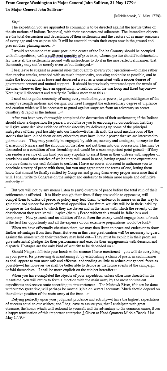 „Bezpośrednim celem jest całkowite zniszczenie i spustoszenie ich osad … Konieczne będzie zniszczenie ich upraw, które są teraz w ziemi i uniemożliwienie im sadzenia kolejnych (…) Zalecałbym (…) posterunek w centrum kraju Indian (…) skąd powinny wyruszyć oddziały w celu spustoszenia wszystkich okolicznych osad, z instrukcją, aby zrobić to w najbardziej skuteczny sposób, tak aby kraj nie został jedynie podbity, ale zniszczony. (…) Ale w żadnym wypadku nie posłuchacie propozycji pokoju, zanim ich osady nie zostaną całkowicie zniszczone. (…) Nasze przyszłe bezpieczeństwo będzie polegało na tym, że nie będą w stanie nas zranić i na przerażeniu, jakie wzbudzi w nich surowość kary, którą otrzymają”