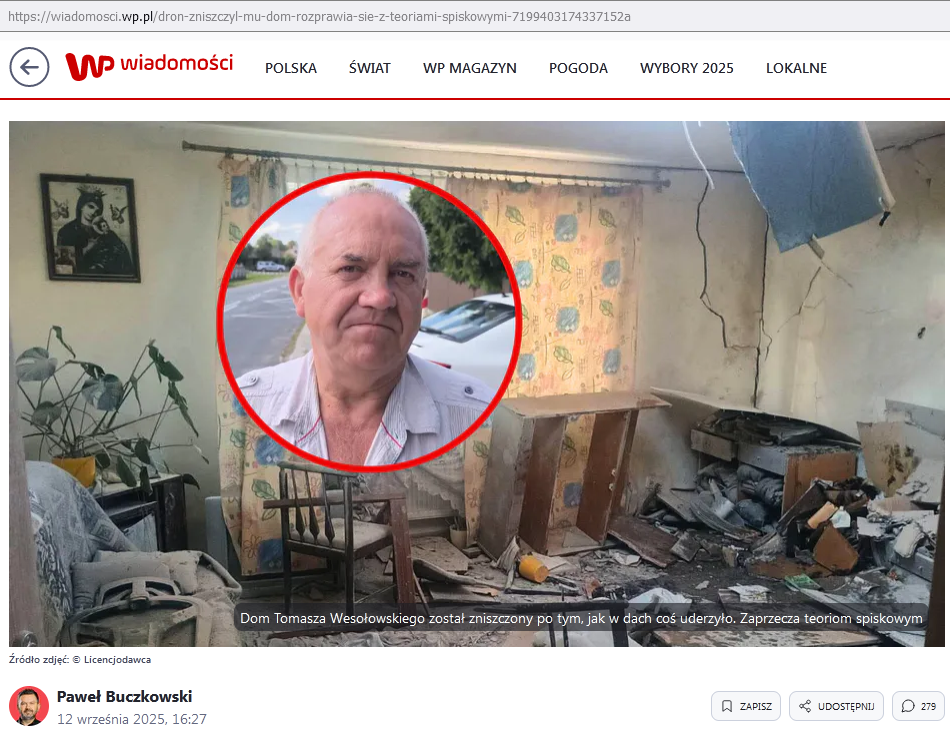 Druga hipoteza jest „kontrowersyjna”. Jak nam trąbiono w mediach w celu zniszczenia dronów ze styropianu i sklejki poderwano myśliwce NATO nawet z Danii. Do dronów odpalono z lecących nisko myśliwców ileś tam rakiet typu powietrze-powietrze. No i te rakiety ponoć większość tych dronów zniszczyły (Sała NATO! Obrońcom nieba III RP sała!). Problem polega na tym, że jak się strzela po nisko lecącym celu i nie trafi, to rakieta powietrze-powietrze, nawet jeśli zdąży w niej zadziałać mechanizm autodestrukcji (a obowiązkowo taki mechanizm ma) zmienia się w rakietę powietrze-ziemia – i albo wlatuje w różne miejsca w postaci odłamków, albo, gdy ktoś ma pecha – wlatuje gdzieś tam w całości i autodestrukcji dokonuje w miejscu do tego nie przewidzianym, np. u kogoś na strychu.