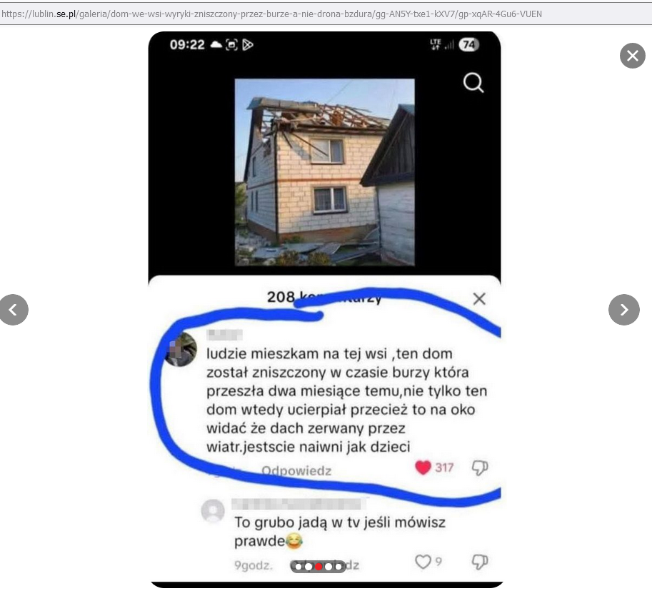 W czasie, gdy w polską przestrzeń powietrzną weszły „Gerbery” doszło do uszkodzenia domu Tomasza Wesołowskiego w Wyrykach. W sieci po incydencie pojawiły się następujące dezinformacje, częściowo szerzone przez pracowników rosyjskich służb wojny informacyjnej, częściowo – przez zdezorientowanych lub wykazujących złą wolę Polaków – być może ze służb specjalnych … III RP: