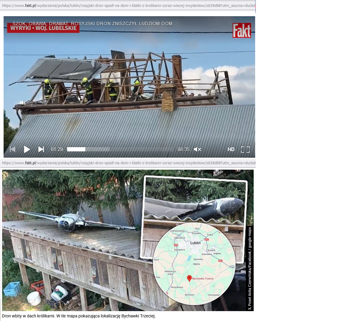 Jeden dron rzekomo spada na kryte eternitem królicze klatki i nawet nie łamie eternitu, nie wbija się do środka. Drugi dron (czy nie dron?) wbija się przez ścianę na strych, jakiś jego (drona albo i nie drona) fragment demoluje kawał elewacji, przy czym uderzenie jest na tyle silne, że pęka ściana zewnętrzna budynku, co widać na zdjęciu z wnętrza pomieszczenia. Eksplozja na strychu zmiata cały dach i wybija dziurę w stropie pomieszczenia.